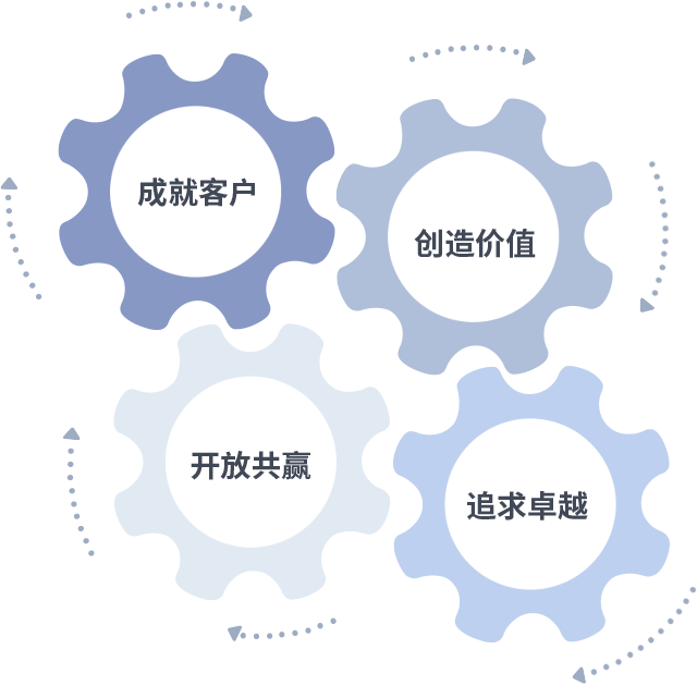 成就客户是一切决策的出发点,,,,创造价值是衡量所有工作的标准,,,,追求卓越是我们做事做人的态度,,,,开放共赢是我们的格局也是最终的结果。。。价值观的齿轮环环相扣,,,,推动着组织里的每个人不断向前。。。。